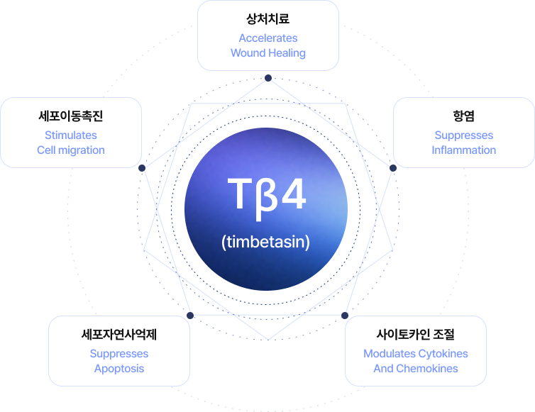 초기에는 사이모신 베타 4는 actin과 결합하여 세포의 이동을 촉진하는 것이 주요 역할로 알려졌으나, 피부의 상처 치유 효과가 알려지면서 피부 조직뿐만 아니라 눈의 각막 및 ischemia 현상이 유발된 심장이나 뇌의 상처치유에 중요한 역할을 하는 단백질임을 보고되고 있습니다.